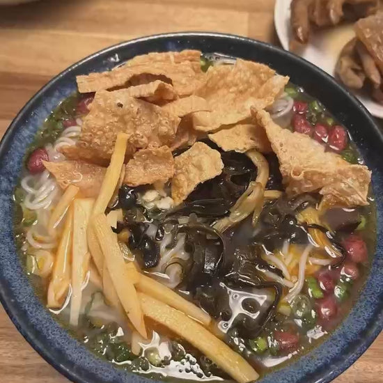 2,冷水粉:选用柳州本地专供螺蛳粉店的米粉,只适用于螺蛳汤底。需要先用冷水泡8个小时(我们已经事先泡好了的,包装里取出来直接沸水下锅,煮1-2分钟即可食用)。口感韧滑,有嚼劲,米香四溢